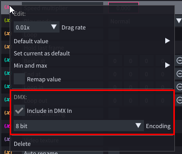 If you want to temporarily disable DMX setting a particular variable, you can disable the DMX flag. This flag will turn green if that DMX variable is currently being set by DMX.
