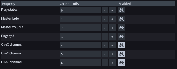 Every property that can be controlled with DMX takes one channel in the Timeline's footprint. Which channel it is, is determined by the Channel offset column.