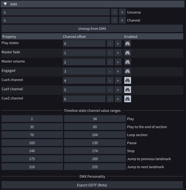 Play state of a timeline is governed by one DMX channel determined by the Timeline's starting channel and Channel offset setting.&#x20;