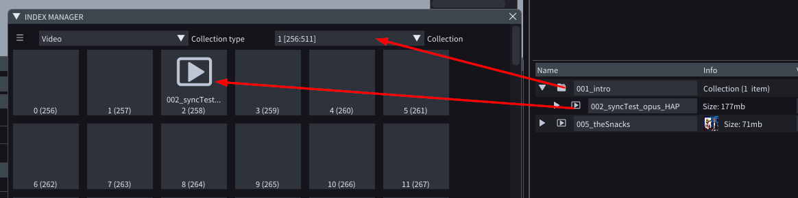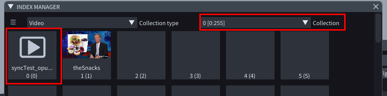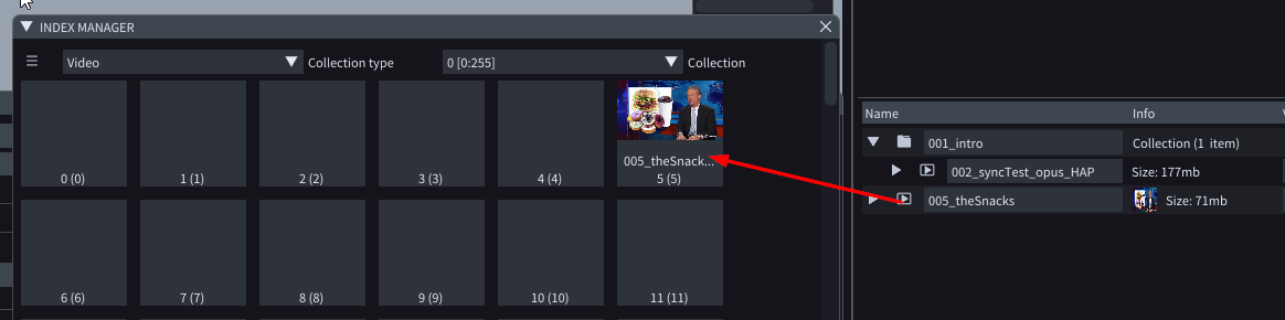 The video asset *002\_syncTest\_opus\_HAP.mov* video asset is assigned to slot 002 (because of the '002\_' in its name) and collection 1, because it's in an *Asset collection* called *001\_intro*.