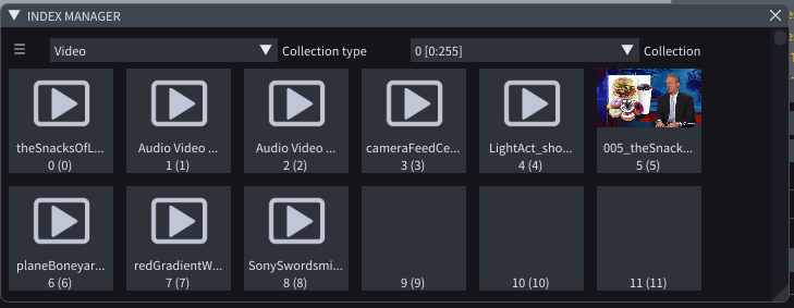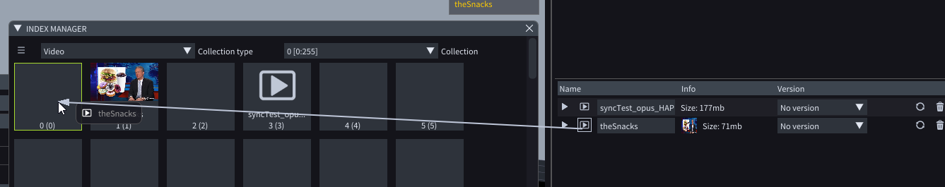 For example, the video asset *005\_theSnacks.mp4* is assigned to collection 0 because it's not in any *Asset collection* (in the *Assets* window). In this collection, it is assigned to slot 5, because it has 005 in the beginning of its name.
