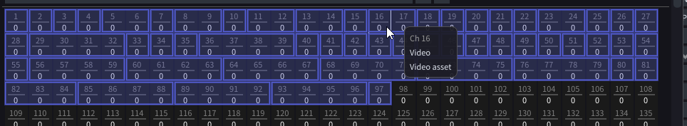 When you assign a particular layer to DMX In window, you'll see which channel these variables will listen to. In the above example *Video asset* variable of the *Video* layer will be determined by channel 16 and 17. In the above image, both of these channels are 0.