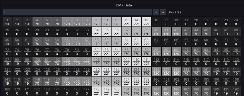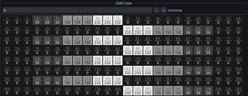 After the mapping, if *Send DMX* checkbox in *DMX Out* window has been enabled, our *DMX Data* grid should look something like this: