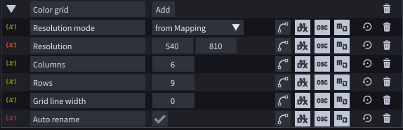 * **Resolution mode**: select if you want the resolution of the color grid to adapt to the resolution of the mapping or would you like to use a custom resolution.