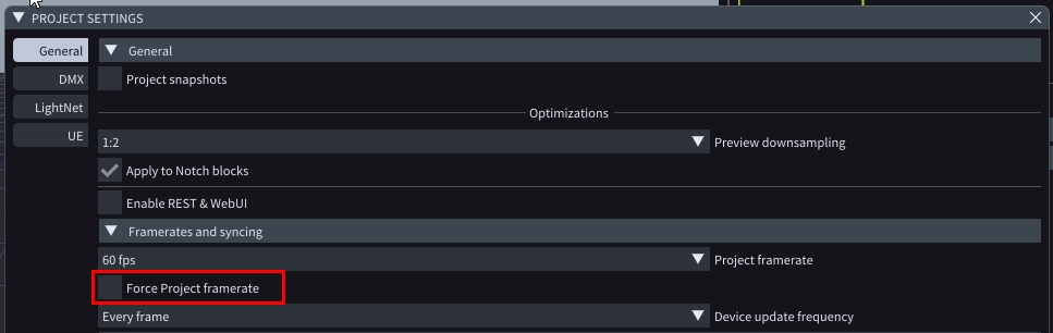 Force project framerate is now off by default. Project framerate matches content, while application framerate follows the display refresh rate. When the display refresh rate exceeds the content rate, playback remains smooth, making forcing unnecessary. Note: this setting is effectively ignored once any output is enabled.