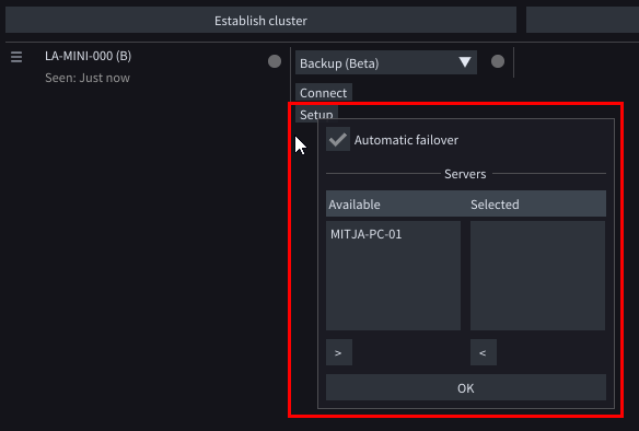 Configure specific backup servers to manage designated servers, with an optional automatic failover feature. A "Setup" button allows assigning server responsibilities. By default, automatic failover is disabled, but enabling it reveals server assignment options. This feature is contingent upon a specific licence condition and is reflected in server roles.