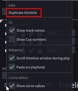 Add 'Duplicate Timeline' option to the Properties menu in the Timeline editor for enhanced accessibility.
