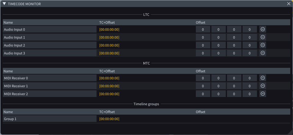 Redesigned timecode monitor to always display all TC sources, allowing name editing and offsets. Displays "No MIDI Receiver" when no sources are present.