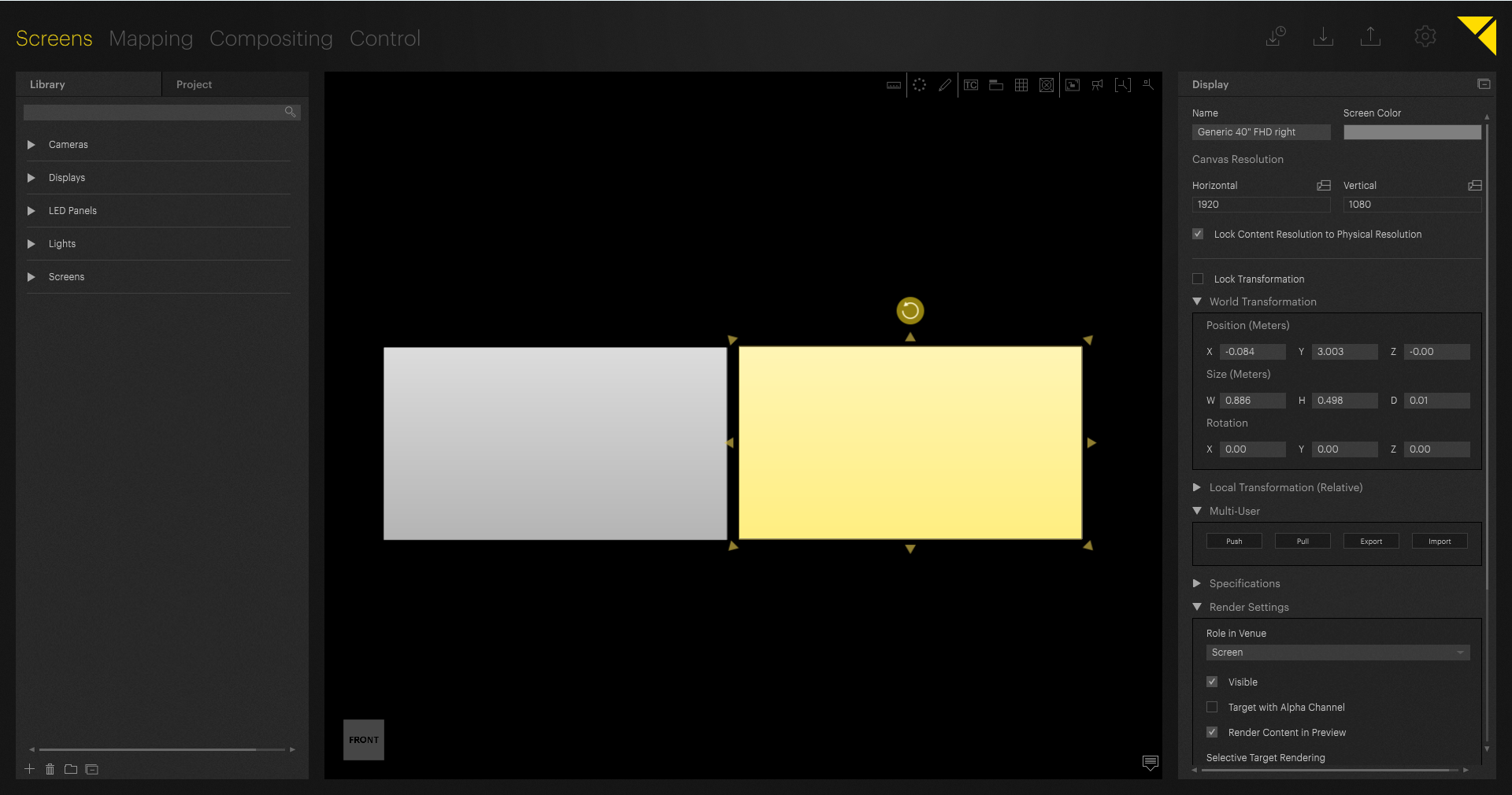 In *Screens* tab in Pixera, you set out the virtual screens. These functionalities can be found in LightAct's *Viewport*.